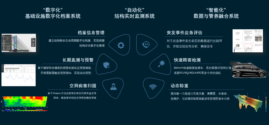 智慧管養(yǎng)平臺包含數(shù)字化檔案系統(tǒng)、結(jié)構(gòu)實時監(jiān)測系統(tǒng)、數(shù)據(jù)與管養(yǎng)融合系統(tǒng)三大模塊,具有檔案信息管理、長期監(jiān)測與預(yù)警、空洞病害掃描、突然事件應(yīng)急評估、快速路面檢測、車輛荷載管理等功能。