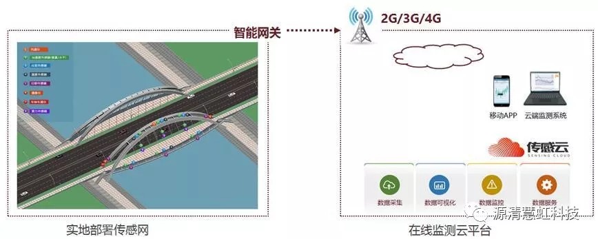 其實現(xiàn)方式是在結(jié)構(gòu)關(guān)鍵部位部署傳感器組成傳感網(wǎng),通過2G/3G/4G網(wǎng)絡(luò)將監(jiān)測數(shù)據(jù)實時傳輸至云平臺,云平臺對監(jiān)測數(shù)據(jù)進行多種智能算法分析。各權(quán)限的管理員可通過網(wǎng)頁或移動端APP訪問監(jiān)測數(shù)據(jù)、查看預(yù)警信息、下載相關(guān)統(tǒng)計報表及數(shù)據(jù)分析報告。